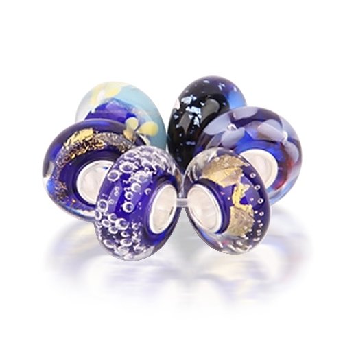 This Royal Purple Murano Glass Bead Bundle features six beautiful, artistically-crafted, round, glass beads. Each barrel bead is made of Murano glass, blown to measure .5" in diameter, with a 4mm .925 sterling silver core. In royal shades of purple and blue, no two beads in this bundle are alike. The dominant colors of this Bead Bundle .925 Pandora Compatible are deep purple and royal blue. The cool plum and blue tones of these glossy beads are warmed with gold paint splatters, bright baby blue streaks, and yellow floral patterns. They are perfect for your personalized European Story bracelet! Give them as gifts or add these Pandora compatible bead charms to your designer inspired charm beads bracelet. With a wide range of available patterns -- such as love beads, crystal beads, glass beads, heart beads, charm beads kids beads, sterling silver charm beads, birthstone beads, Murano glass beads, enamel beads, and animal beads -- you're sure to find the glass charm you're looking for. These and other Murano glass beads fit Pandora bracelets. Pandora compatible beads also give your Italian charm bead bracelet, necklace, earrings, or key chain a story of their own. Compatible with Pandora, Biagi, Chamilia, and Troll beads!